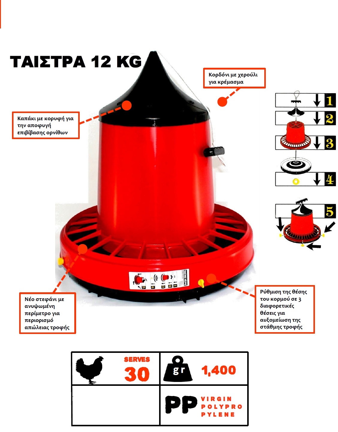 - Καπάκι με κορυφή για είναι προστατευμένη η τροφή & να μην ανεβαίνουν επάνω τα πτηνά.